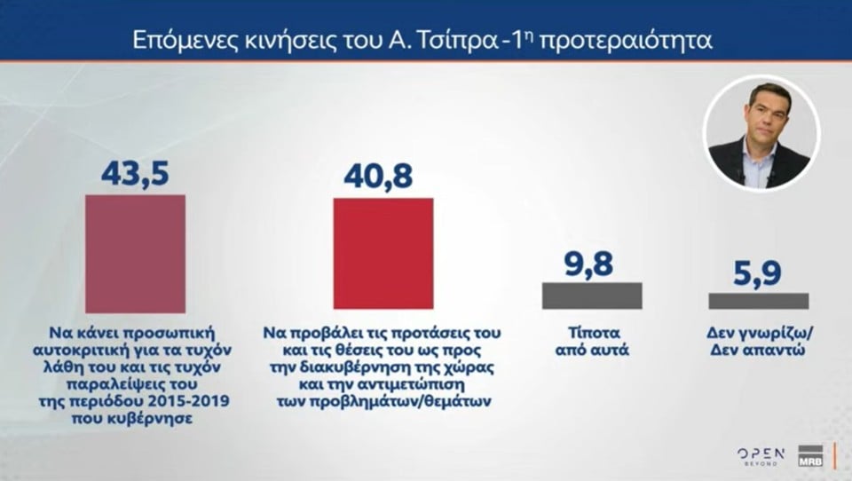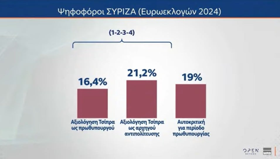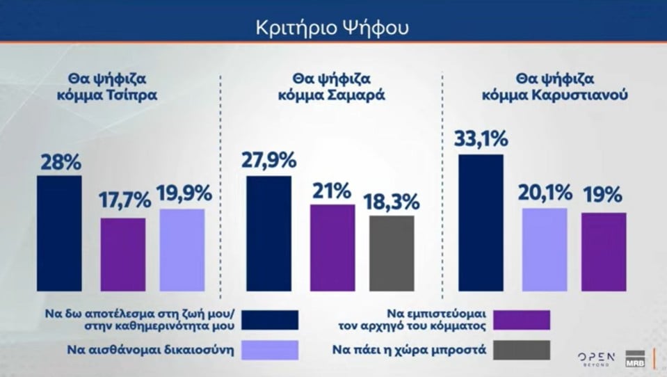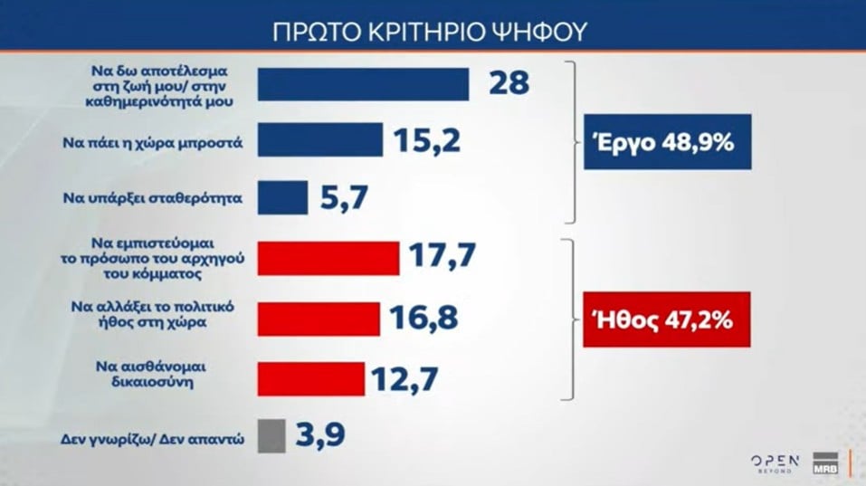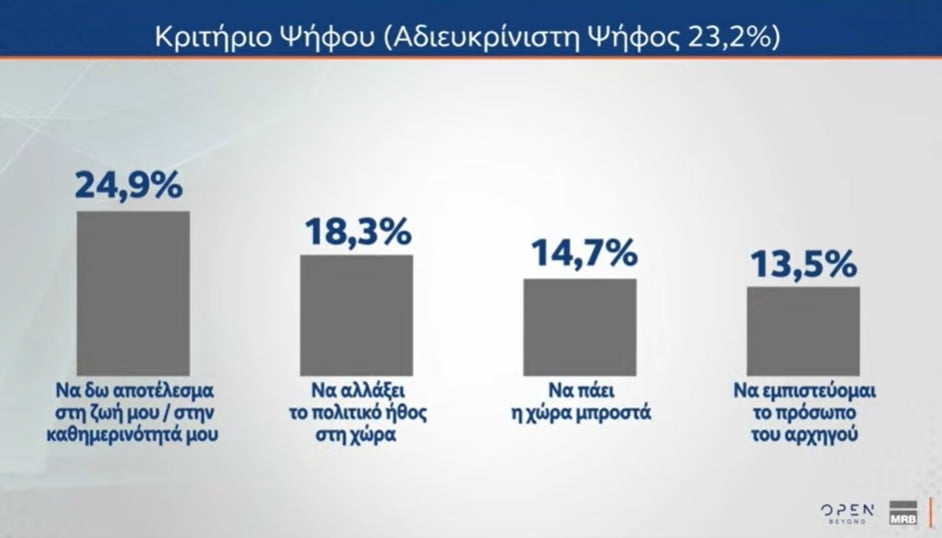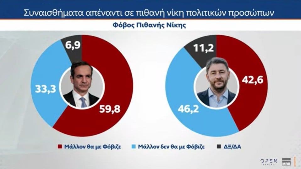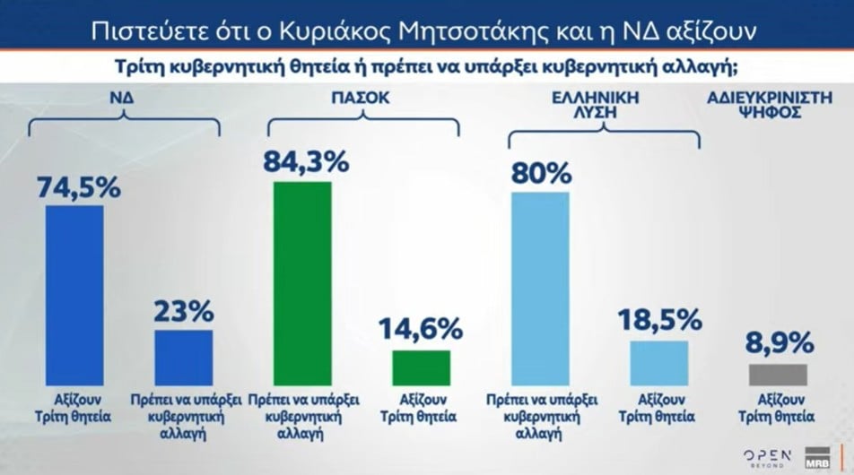 Σύμφωνα με τα ευρήματα του δευτέρου μέρους της έρευνας της MRB, για λογαριασμό του OPEN, στο γενικό σύνολο – και όχι σε επίπεδο κομμάτων – το 69,5% των ερωτηθέντων πιστεύει ότι «μάλλον/σίγουρα πρέπει να υπάρξει κυβερνητική αλλαγή», ενώ το 26,4% απαντά πως «σίγουρα/μάλλον» αξίζουν μια τρίτη θητεία ο Κ. Μητσοτάκης και η Νέα Δημοκρατία.