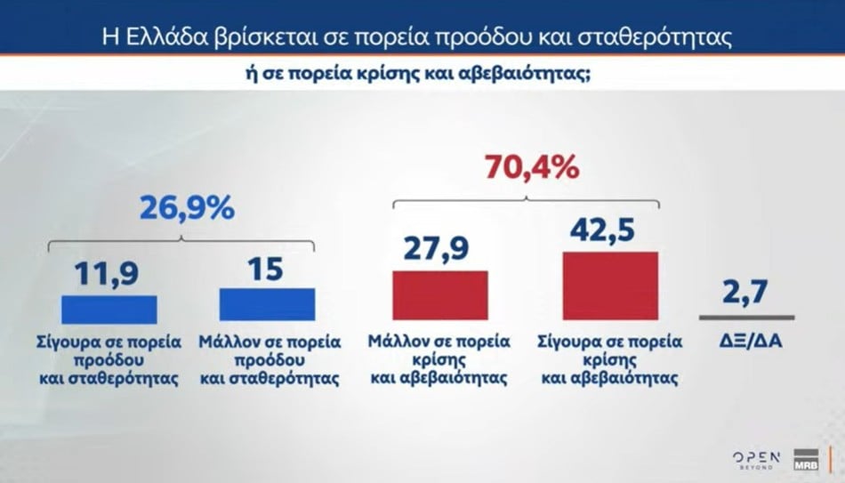 Στο ίδιο ερώτημα, αλλά στον γενικό πληθυσμό, το 70,4% απαντά πως η Ελλάδα είναι «μάλλον/σίγουρα» σε πορεία κρίσης και αβεβαιότητας, ενώ το 26,9% πιστεύει πως «σίγουρα/μάλλον» η χώρα είναι σε πορεία προόδου και σταθερότητας.