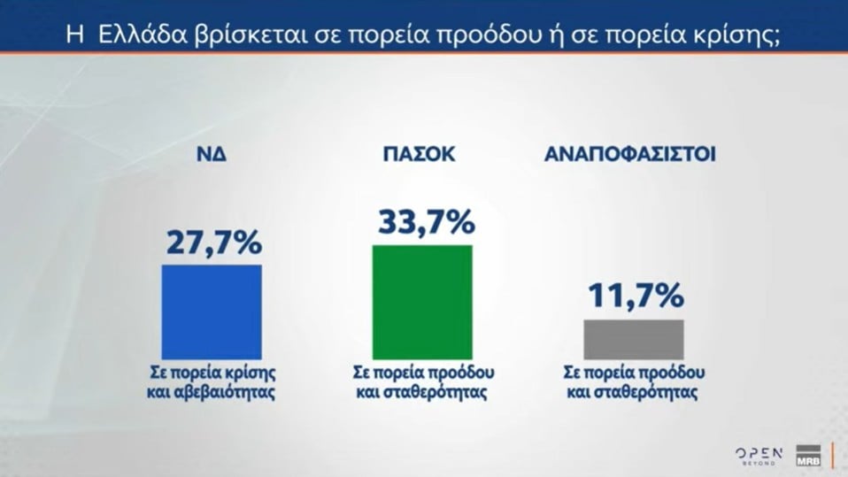 Σε ερώτηση αν η Ελλάδα βρίσκεται σε πορεία προόδου ή σε πορεία κρίσης, το 27,7% των ψηφοφόρων της ΝΔ απαντά πως η χώρα βρίσκεται «σε πορεία κρίσης και αβεβαιότητας», ενώ το 33,7% των ψηφοφόρων της ΝΔ θεωρεί πως η χώρα είναι «σε πορεία προόδου και σταθερότητας».