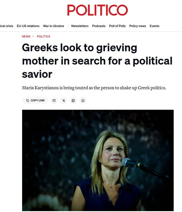Στην Μαρία Καρυστιανού, μητέρα θύματος της σιδηροδρομικής τραγωδίας των Τεμπών, αναφέρεται σε σημερινό του δημοσίευμα το Politico, σημειώνοντας την απήχηση που έχει στην ελληνική κοινωνία και χαρακτηρίζοντάς της ως μια «απρόσμενη ηγετική μορφή» έναντι του ελληνικού πολιτικού κατεστημένου.