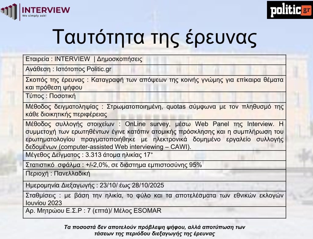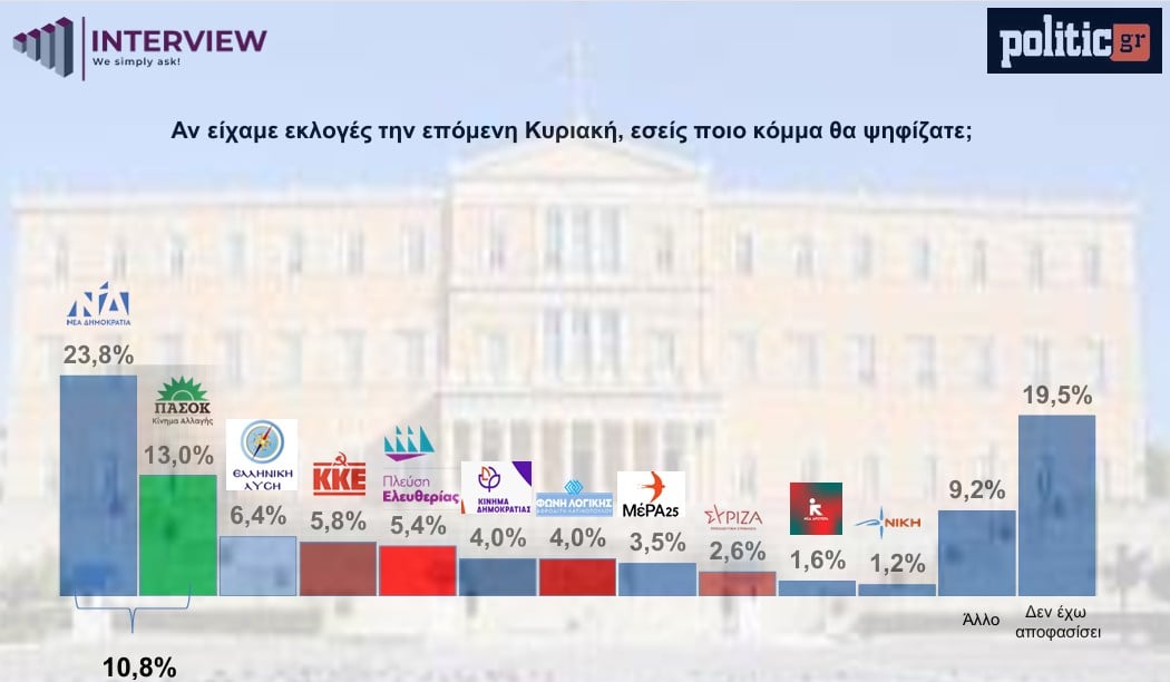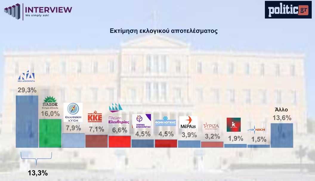 Διψήφιο προβάδισμα της Νέας Δημοκρατίας, απώλειες για την Ελληνική Λύση και την Πλεύση Ελευθερίας και «βουτιά» του ποσοστού του ΣΥΡΙΖΑ καταγράφει νέα δημοσκόπηση της Interview για την POLITIC.