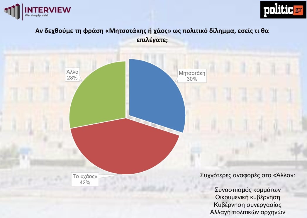 Στο πολιτικό δίλημμα «Μητσοτάκης ή χάος», το 42% των ερωτηθέντων απαντά «το χάος», έναντι 30% που επιλέγουν τον Κυριάκο Μητσοτάκη, ενώ ένα 28% δηλώνει «Άλλο». Οι συχνότερες αναφορές στην κατηγορία «Άλλο» αφορούν προτάσεις όπως συνασπισμός κομμάτων, οικουμενική κυβέρνηση, κυβέρνηση συνεργασίας ή αλλαγή πολιτικών αρχηγών.