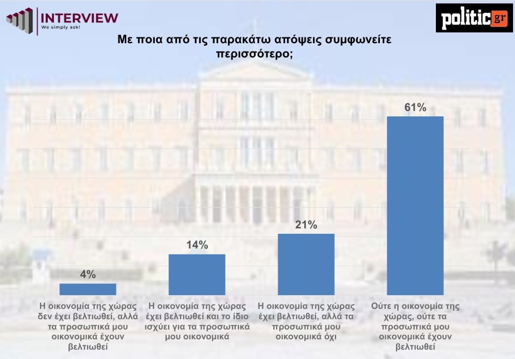 Μόνο το 14% δηλώνει ότι «και η οικονομία της χώρας και τα προσωπικά μου οικονομικά έχουν βελτιωθεί», ενώ μόλις το 4% απαντά πως η οικονομία της χώρας δεν βελτιώθηκε, αλλά τα προσωπικά του οικονομικά βελτιώθηκαν.