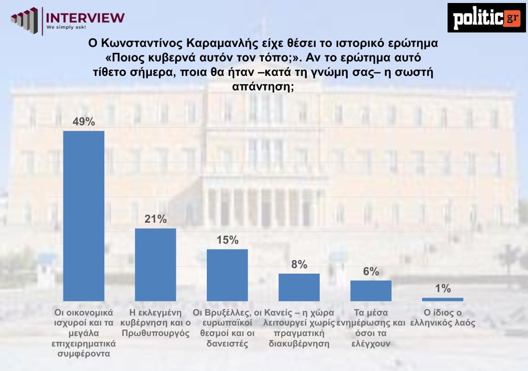 Ηχηρά μηνύμα προκύπτουν και από το επόμενο ερώτημα. Αν ετίθετο σήμερα το ιστορικό ερώτημα του Κωνσταντίνου Καραμανλή «Ποιος κυβερνά αυτόν τον τόπο;», σχεδόν ένας στους δύο πολίτες (49%) θα απαντούσε πως «οι οικονομικά ισχυροί και τα μεγάλα επιχειρηματικά συμφέροντα».