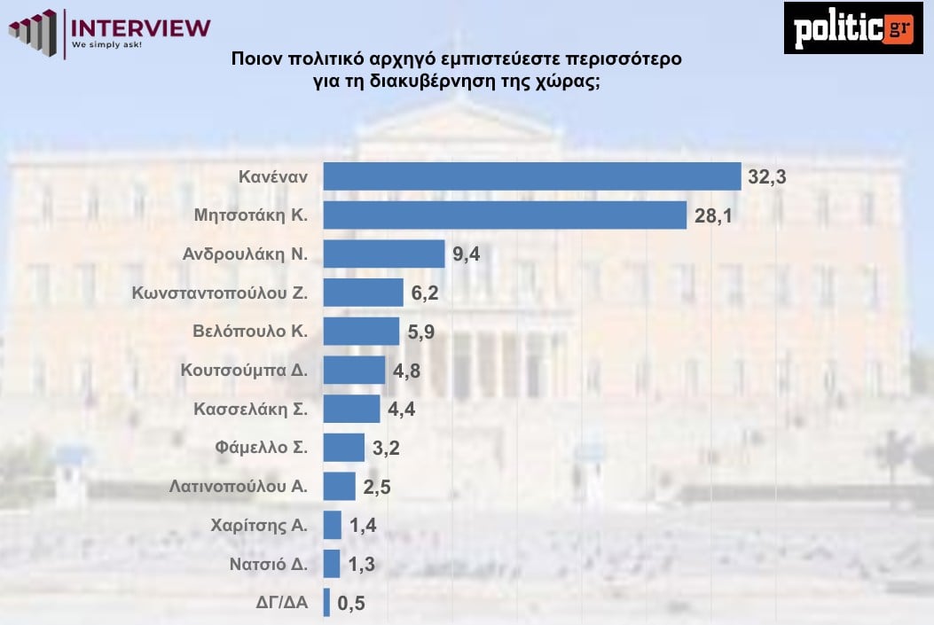 Στην ερώτηση «ποιον πολιτικό αρχηγό εμπιστεύεστε περισσότερο για τη διακυβέρνηση της χώρας;», προηγείται η απάντηση «Κανέναν» με 32,3%, ενώ ο Κυριάκος Μητσοτάκης ακολουθεί με 28,1%.
