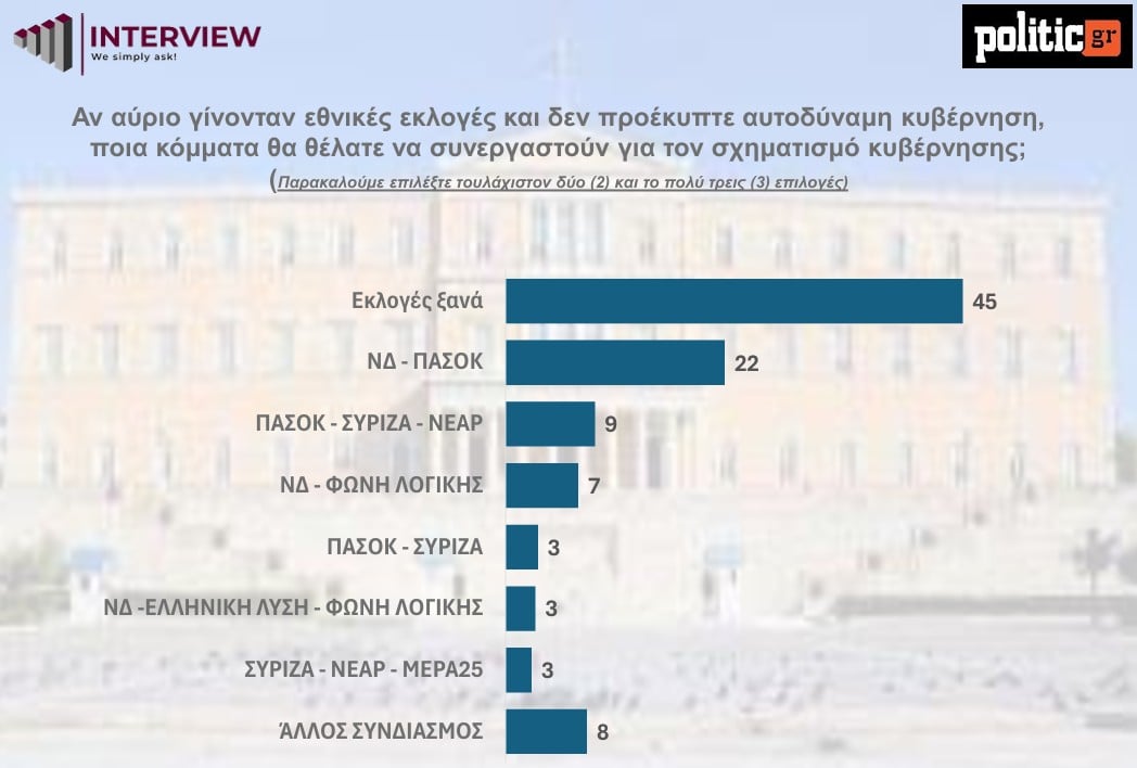 Το 45% των ερωτηθέντων δηλώνει ότι θα προτιμούσε να διεξαχθούν νέες εκλογές, έναντι του 22% που επιλέγει τη συνεργασία Ν.Δ. – ΠΑΣΟΚ, σενάριο που συγκεντρώνει τη μεγαλύτερη αποδοχή.
