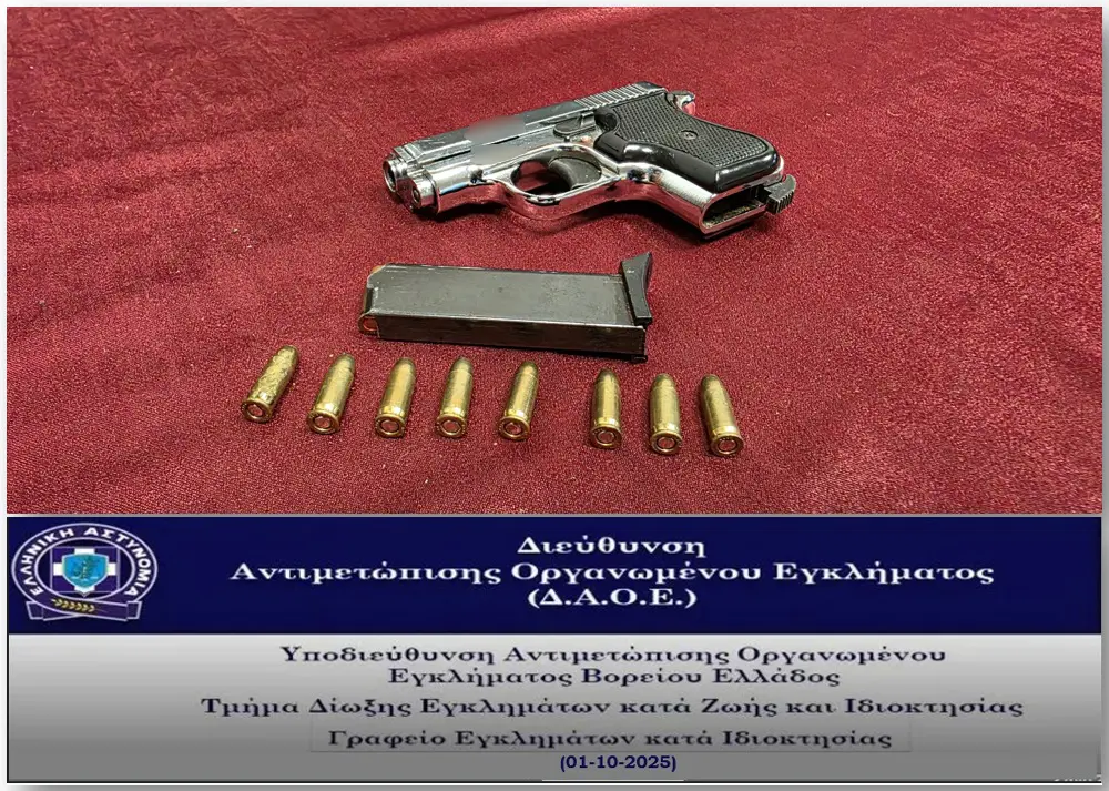 - μεταλλικό πιστόλι με γεμιστήρα που περιείχε 7 φυσίγγια και 8 επιπλέον φυσίγγια σε νάιλον συσκευασία