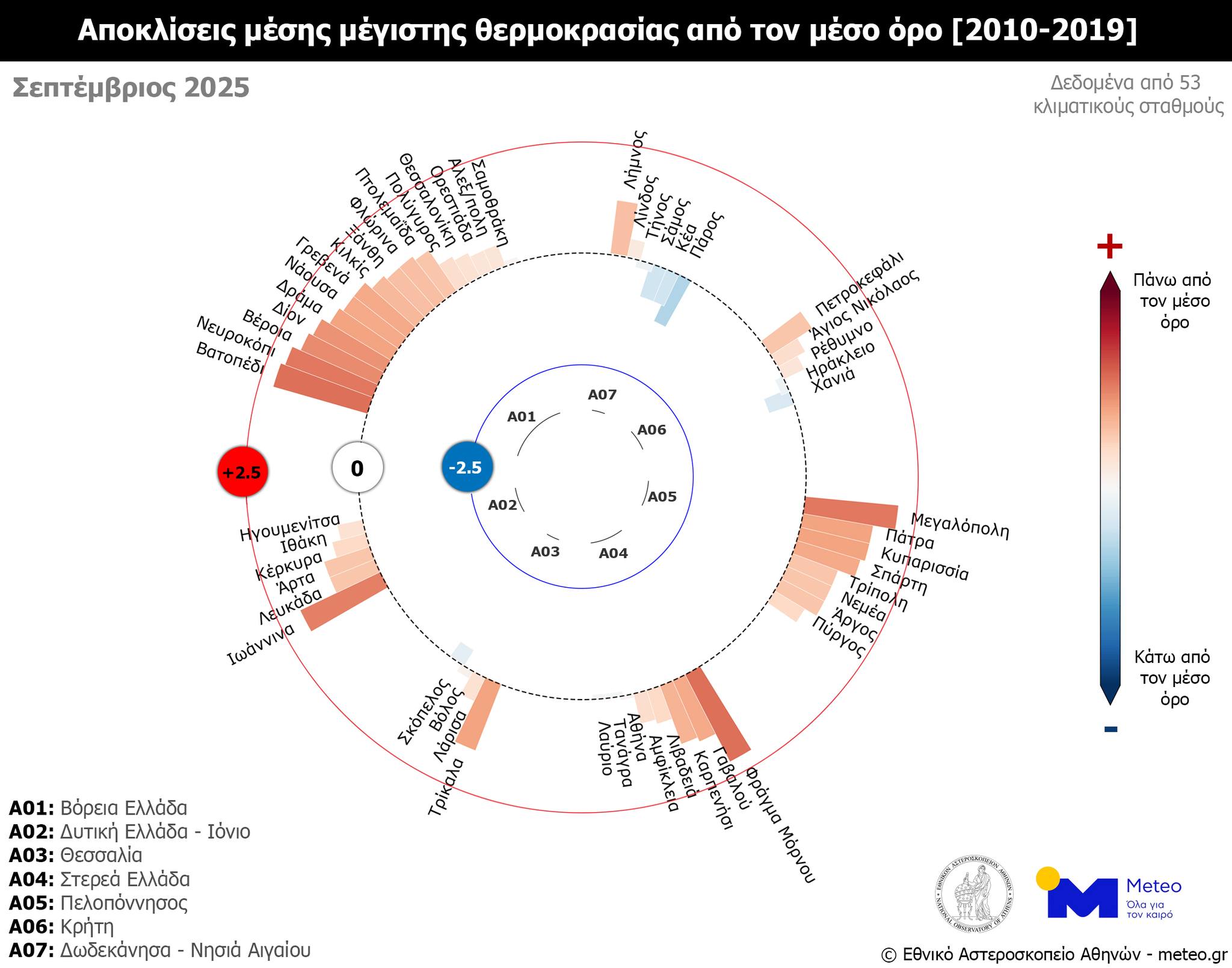Σε υψηλότερα για την εποχή επίπεδα σε όλα τα γεωγραφικά διαμερίσματα, εκτός από τα νησιά του Αιγαίου, όπου καταγράφηκε ελαφρώς χαμηλότερη από τα κανονικά τιμή (σε σύγκριση με τον μέσο όρο της περιόδου 2010-2019), κυμάνθηκε τον Σεπτέμβριο του 2025 η μέση τιμή των μεγίστων ημερήσιων θερμοκρασιών, σύμφωνα με το δίκτυο των 53 μετεωρολογικών σταθμών του meteo.gr του Εθνικού Αστεροσκοπείου Αθηνών (ΕΑΑ), που λειτουργούν από το 2010.