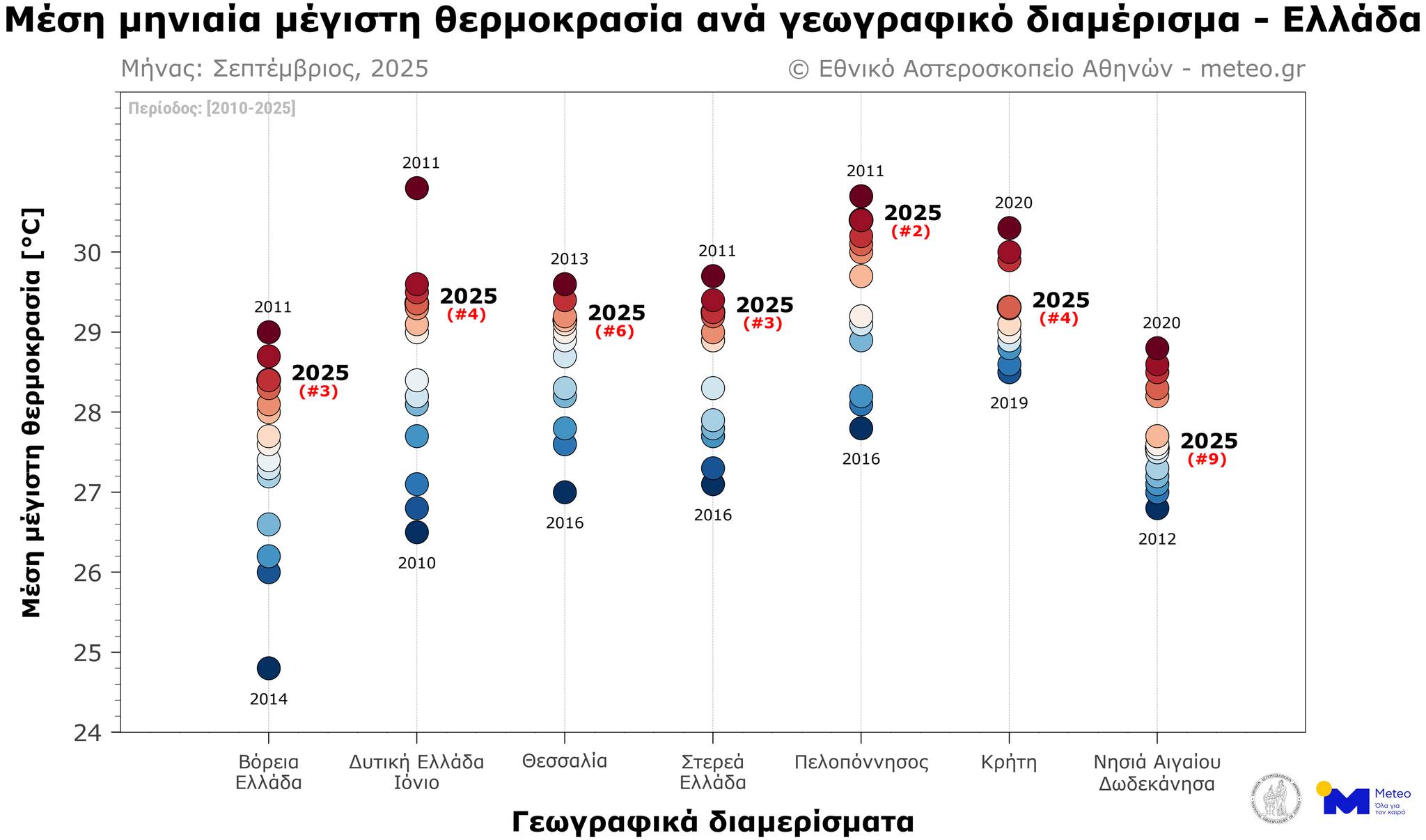 Το επόμενο γράφημα παρουσιάζει την κατάταξη του Σεπτεμβρίου ανά έτος, με βάση τη μέση μηνιαία τιμή της μέγιστης θερμοκρασίας. Στην Πελοπόννησο καταγράφηκε ως ο 2ος θερμότερος από το 2010, στη Βόρεια και Στερεά Ελλάδα ο Σεπτέμβριος του 2025 ήταν ο 3ος θερμότερος, στη Δυτική Ελλάδα – Ιόνιο και την Κρήτη καταγράφηκε ως ο 4ος θερμότερος, και τέλος στη Θεσσαλία και στα Νησιά Αιγαίου & Δωδεκάνησα ως ο 6ος και ο 9ος θερμότερος αντίστοιχα από το 2010.
