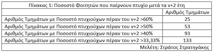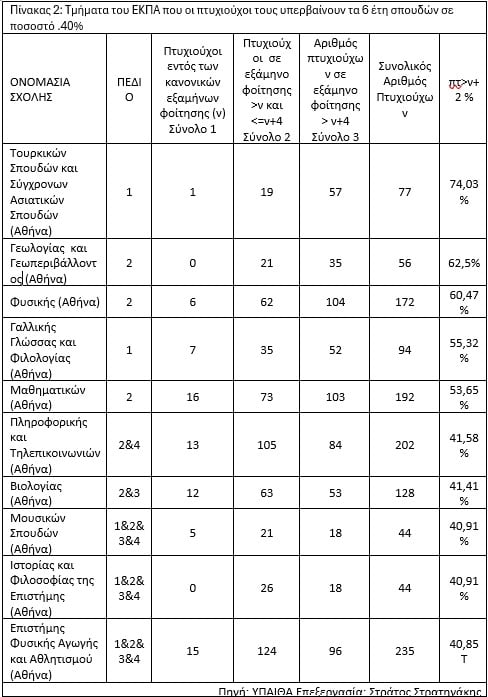 Στη λίστα των Τμημάτων με ποσοστό φοιτητών που παίρνουν το πτυχίο τους μετά τα ν+2 έτη να είναι μεταξύ 40% και 50% βρίσκουμε 40 Τμήματα, όπως το Τμήμα Ηλεκτρολόγων Μηχανικών του Πολυτεχνείου Κρήτης, το Πληροφορικής και Τηλεπικοινωνιών του ΕΚΠΑ, το Βιολογίας Αθήνας, το Μουσικών Σπουδών, Ιστορίας και Φιλοσοφίας της Επιστήμης και ΤΕΦΑΑ του ΕΚΠΑ. Πρόκειται για παλιά, παραδοσιακά καλά Τμήματα του ΕΚΠΑ, που όμως οι σπουδές δεν συμβαδίζουν με τους φοιτητές τους.