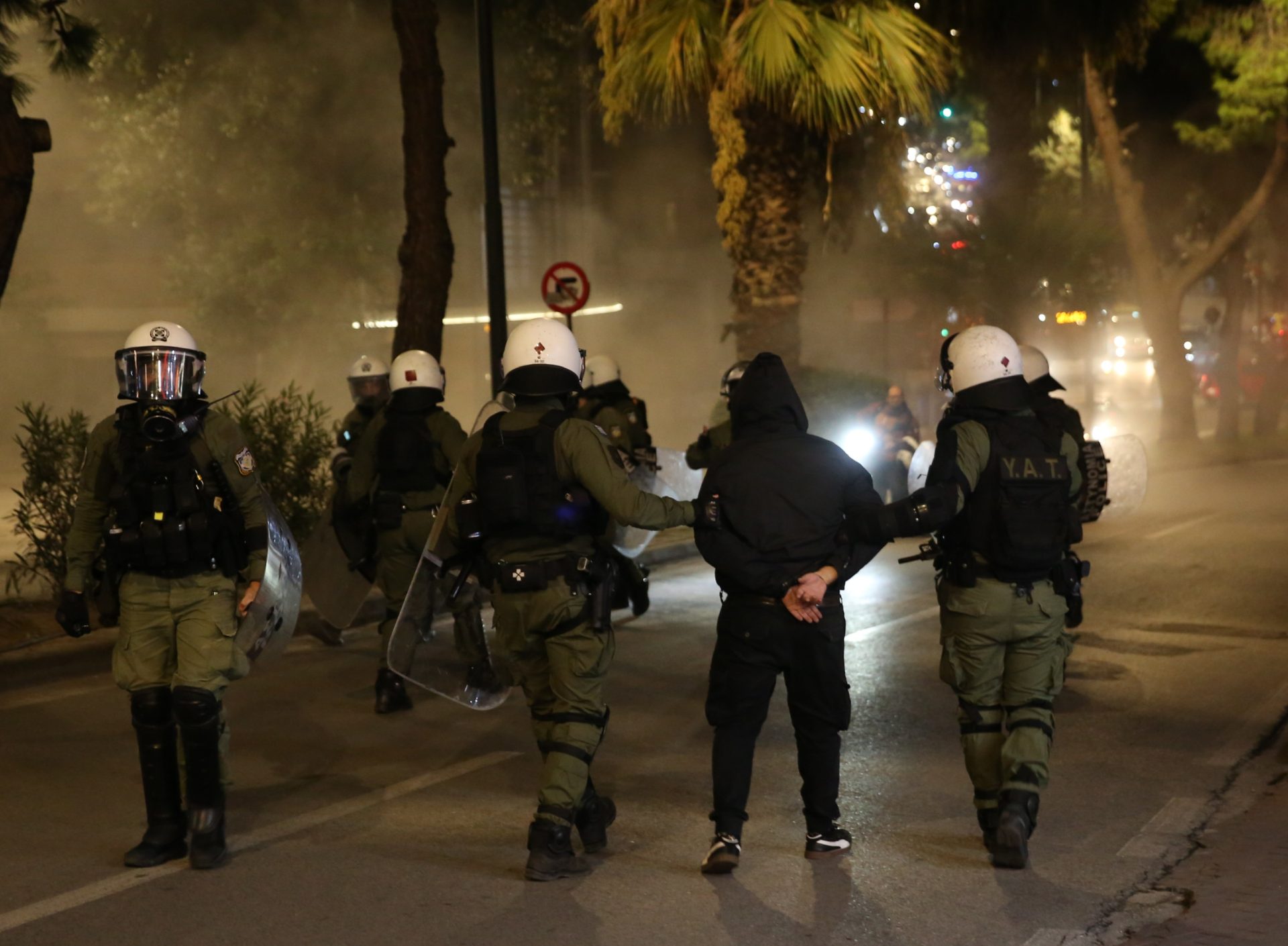 Τότε έγινε και μια ρίψη βόμβας μολότοφ, με αποτέλεσμα η αστυνομία οι διμοιρίες να απωθήσουν τους διαδηλωτές σε τρεις κατευθύνσεις: στην κάθοδο της Λ. Κηφησίας προς τη Βασιλίσσης Σοφίας, προς την οδό Πανόρμου και προς την οδό Κατεχάκη. Η αστυνομία προχώρησε σε αρκετές προσαγωγές.