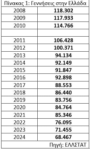 Τις περισσότερες γεννήσεις από το 1984(125.724) είχαμε στην Ελλάδα το 2008 με 118.302 γεννήσεις. Το 2024 οι γεννήσεις έπεσαν στις 68.367, σχεδόν το μισό από το 1984. Το 2008 ήταν η προτελευταία χρονιά της ευδαιμονίας. Μετά ήρθε η οικονομική κρίση που μας γέμισε με φόβο και απαισιοδοξία για το μέλλον. Αυτός είναι και ο βασικότερος λόγος που οι γεννήσεις μειώθηκαν.