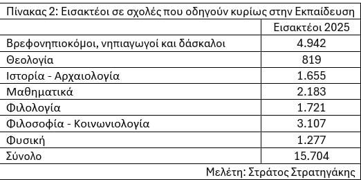 Όλοι αυτοί οι πτυχιούχοι έχουν την κουλτούρα του εκπαιδευτικού. Πίσω από αυτούς έρχονται οι ήδη φοιτητές, αλλά και όσοι πρόκειται να εισαχθούν τα επόμενα χρόνια. Στο πίνακα 2 βλέπουμε πόσοι εισακτέοι σε σχολές που οδηγούν και στην εκπαίδευση εισάγονται κάθε χρόνο στα ΑΕΙ της χώρας μας. Πρέπει να τους πούμε ότι δεν θα υπάρχουν θέσεις εργασίας για τους περισσότερους από αυτούς στην εκπαίδευση. Συνεπώς, πρέπει να αρχίσουν να προσανατολίζονται αλλού. Αυτό δεν σημαίνει ότι δεν πρέπει να σπουδάσουν αυτά τα επιστημονικά αντικείμενα, αλλά πρέπει να βγάλουν από το μυαλό τους την εργασία στην εκπαίδευση, διότι ελάχιστοι θα βρουν θέση εργασίας. Η υπερπροσφορά εργαζομένων θα διαιωνίσει τους χαμηλούς μισθούς όσων, τελικά, βρουν μία θέση εργασίας στην Εκπαίδευση.