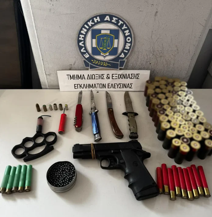 Με όπλο έφθασε 17χρονος στην αυλή σχολείου στην Ελευσίνα. Και ο ανήλικος, και οι γονείς του, 45 και 53 ετών, συνελήφθησαν από αστυνομικούς του τοπικού Τμήματος Δίωξης και Εξιχνίασης Εγκλημάτων, κατηγορούμενοι -κατά περίπτωση- για παράβαση του νόμων περί όπλων και περί φωτοβολίδων, απειλή, εξύβριση καθώς και για παραμέληση εποπτείας ανηλίκων.