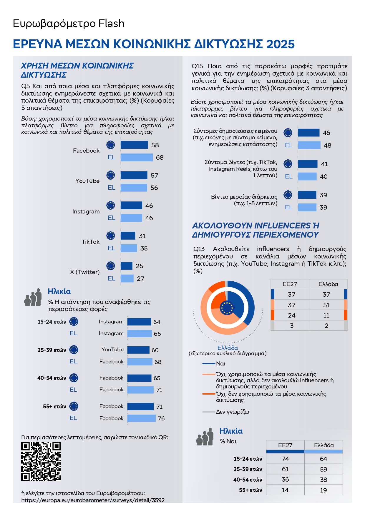Τα μέσα κοινωνικής δικτύωσης είναι πλέον το κυρίαρχο μέσο ενημέρωσης για πολιτικά και κοινωνικά ζητήματα για την πλειοψηφία των πολιτών στην Ελλάδα. Πάνω από πέντε στους δέκα (56%) χρησιμοποιούν στην Ελλάδα πλατφόρμες κοινωνικής δικτύωσης για να ενημερωθούν και δεύτερη έρχεται η τηλεόραση (54%), σε αντίθεση με τον μέσο όρο της ΕΕ που φαίνεται να προτιμά ακόμα την τηλεόραση για να ενημερωθεί (71%).