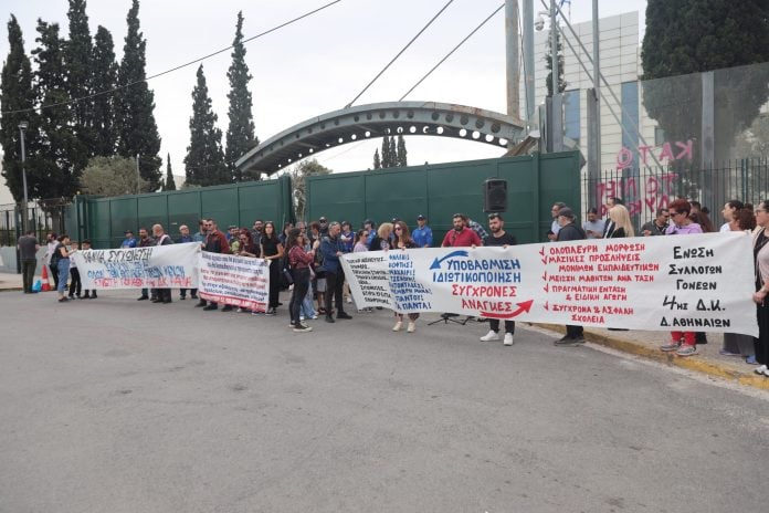 Γονείς και εκπαιδευτικοί διαμαρτύρονται έξω από το Υπουργείο Παιδείας για τη συγχώνευση των ολιγομελών τμημάτων στα σχολεία.