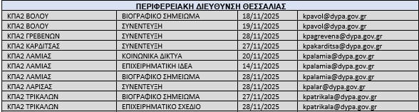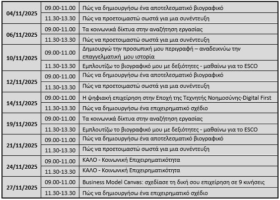 Τα 18 διαδικτυακά e-εργαστήρια διάρκειας 2 ωρών θα πραγματοποιηθούν από εργασιακούς συμβούλους στις ημερομηνίες του παρακάτω πίνακα.