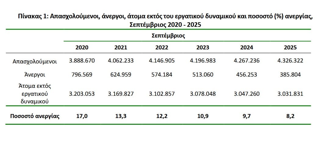 - Οι άνεργοι ανήλθαν σε 385.804 άτομα, σημειώνοντας μείωση κατά 70.449 άτομα σε σχέση με τον Σεπτέμβριο 2024 (15,4%) και μείωση κατά 384 άτομα σε σχέση με τον Αύγουστο 2025 (0,1%).