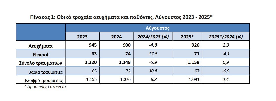 Από τα παθόντα πρόσωπα των οδικών τροχαίων ατυχημάτων, καταγράφηκαν 71 νεκροί, 67 βαριά τραυματίες και 1.091 ελαφρά τραυματίες. Πρόκειται για μείωση 4,1% σε νεκρούς, μείωση 6,9% σε βαριά τραυματίες και αύξηση 1,4% ελαφρά τραυματίες σε σχέση με τον Αύγουστο του 2024.